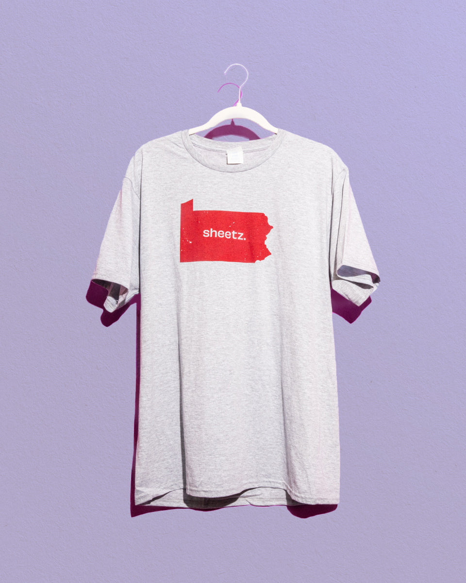 So, you think you’re a freak, huh? Then Why the Sheetz Not… DRESS LIKE IT?! Show the world where you hail from – and do it proudly in the Reppin’ Red Sheetz tee! This super-soft, solid grey cotton-blend tee has a 1-color maroon decoration of a full-size state logo. With our Sheetz brand name front and center, nobody will question your freak status (or eye for fashion!)
